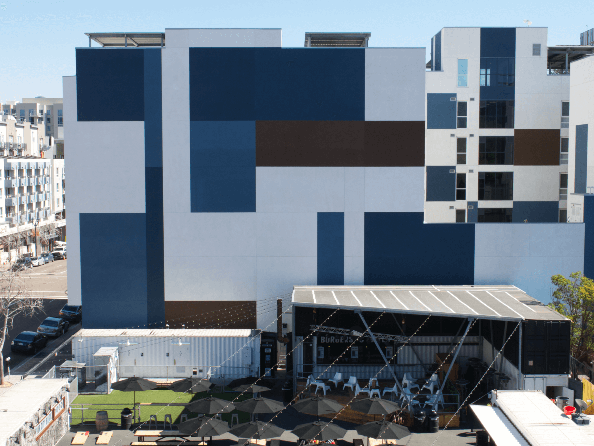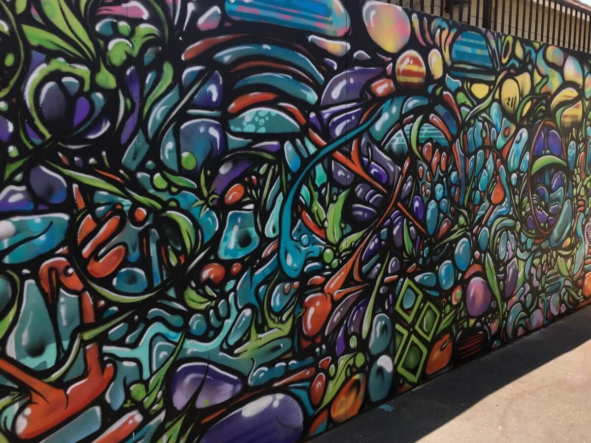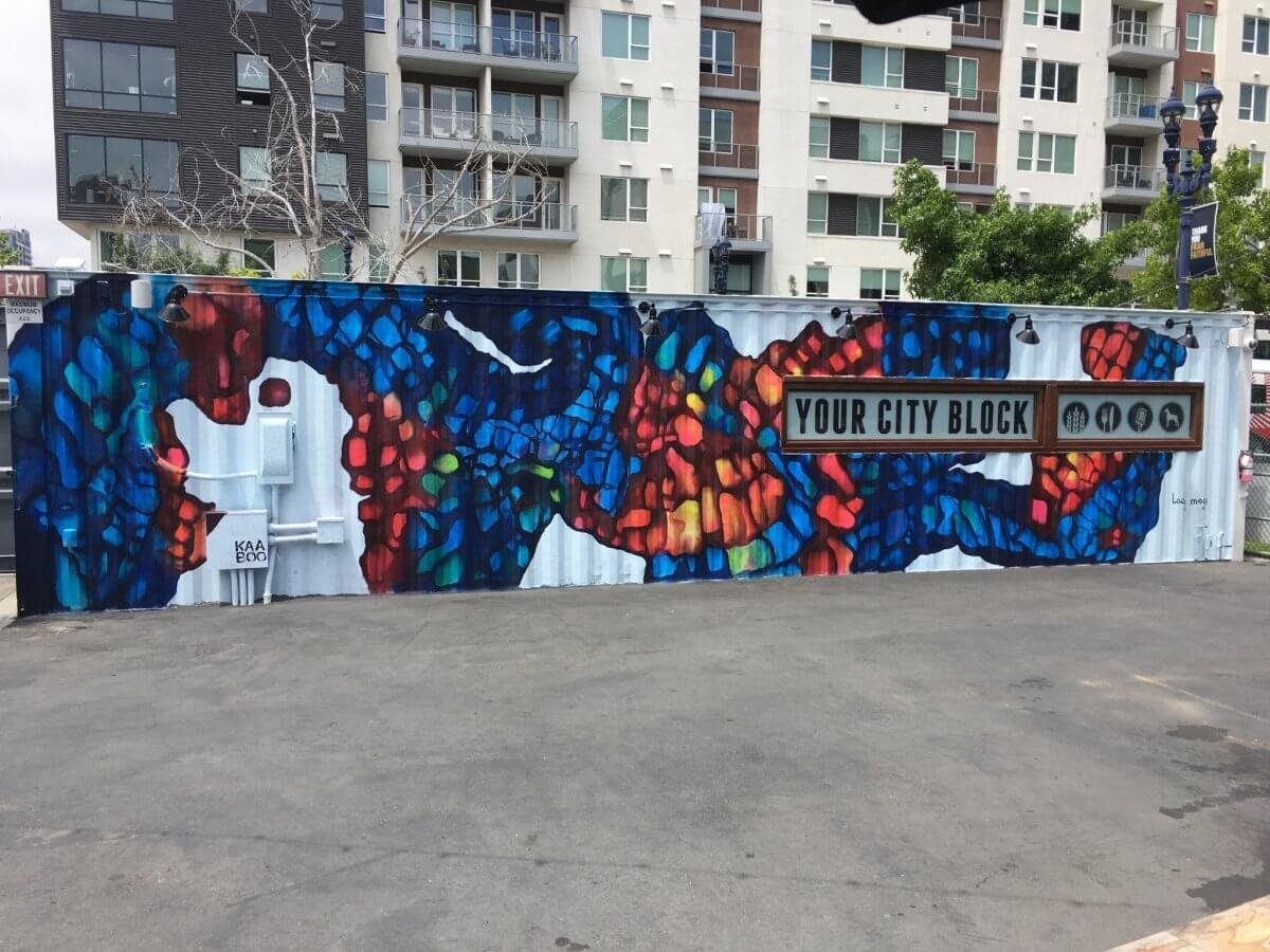 Speaking of Lady Mags, check out her awesome spray paint work on one of our shipping containers! She rendered this abstract design from a smaller idea and expanded the idea across the container beautifully. The two collaborative artists created their own pieces simultaneously at our Taste of KAABOO event.